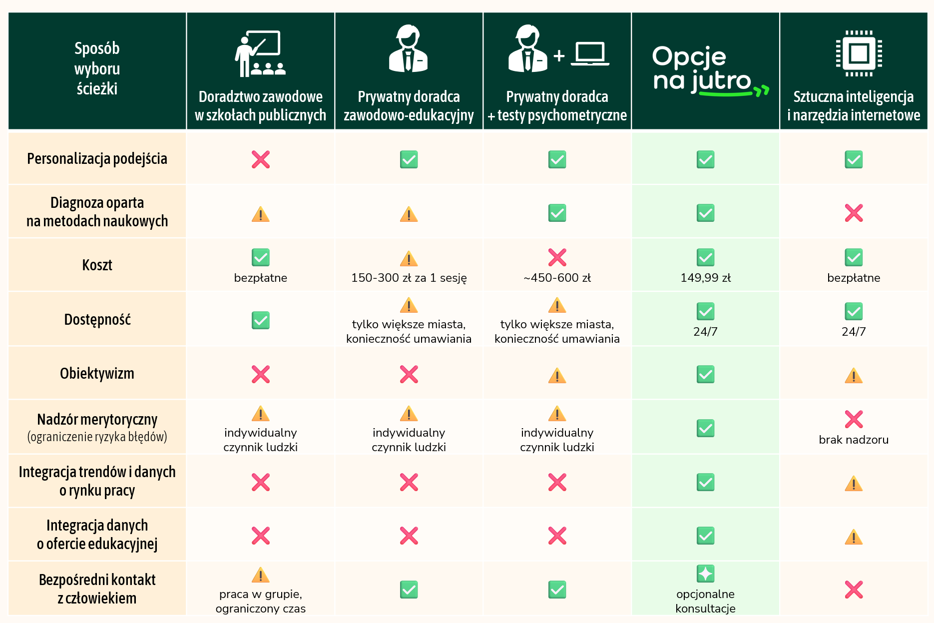 „Opcje na jutro” wyróżniają się: wybitną trafnością i kompletnością dzięki cyfryzacji procesu doradztwa, przyjaznym formularzem, skrupulatnie dobranym algorytmem stworzonym pod nadzorem psychologa, psychometrysty. Pozwala to na analizowanie większej liczby zmiennych niż jest w stanie uwzględnić ludzki umysł doradcy. Naszym celem jest dostarczanie rozwiązania bardziej dostępnego, trafnego i efektywnego w porównaniu do tradycyjnych metod.